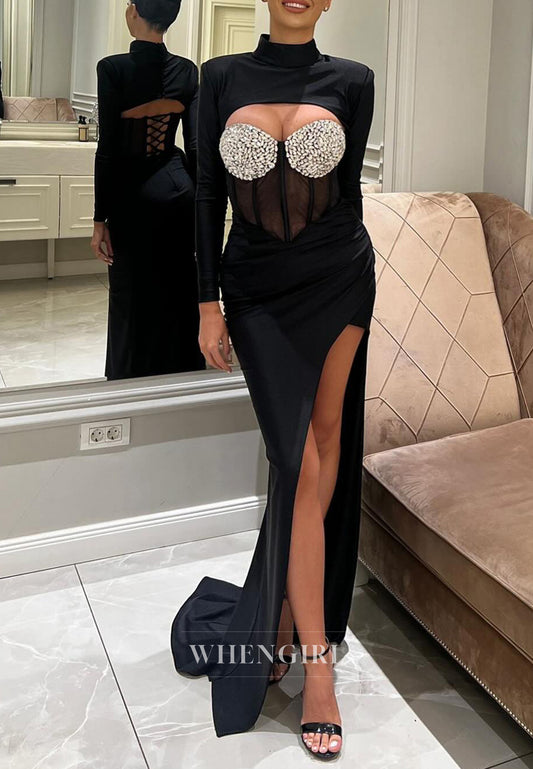 Black High Neck Long Sleeves Formal Dress Beaded Side Slit Sweep Train Sheath Evening Gown