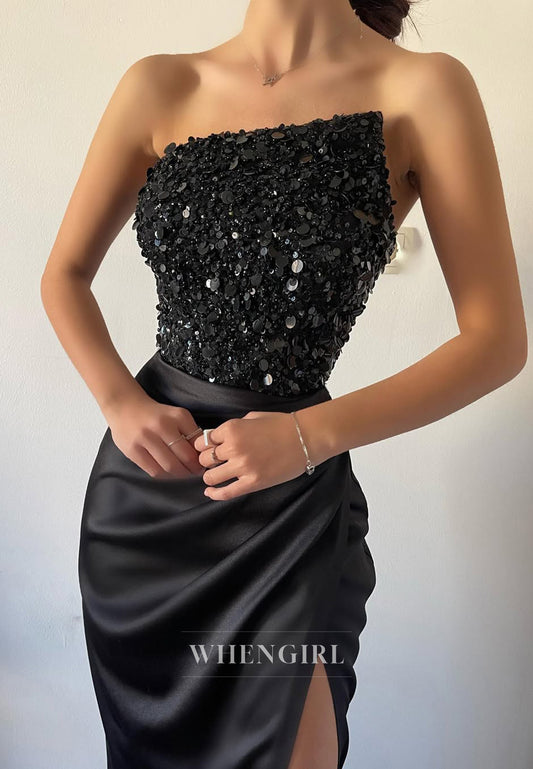 Black Strapless Beaded Charming Evening Dress Mermaid Split With Gloves