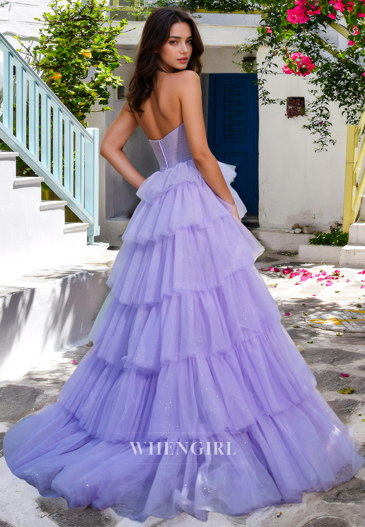 Charming A-Line Sweetheart Straps Sparkly Appliques Lace Ball Gown with Slit Party Gown