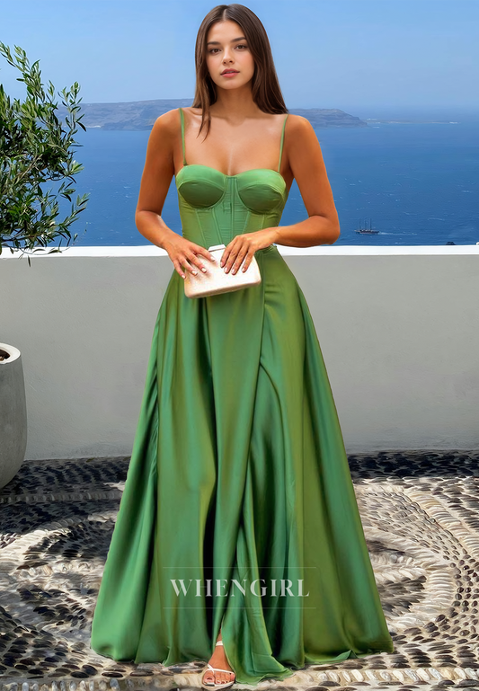 Classic Square Neck Straps Fitted Satin Pleated Satin Formal Prom Gown with Slit