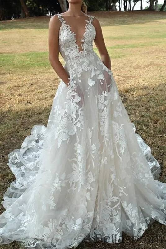 Sleeveless A-Line Wedding Gowns Long With Appliques