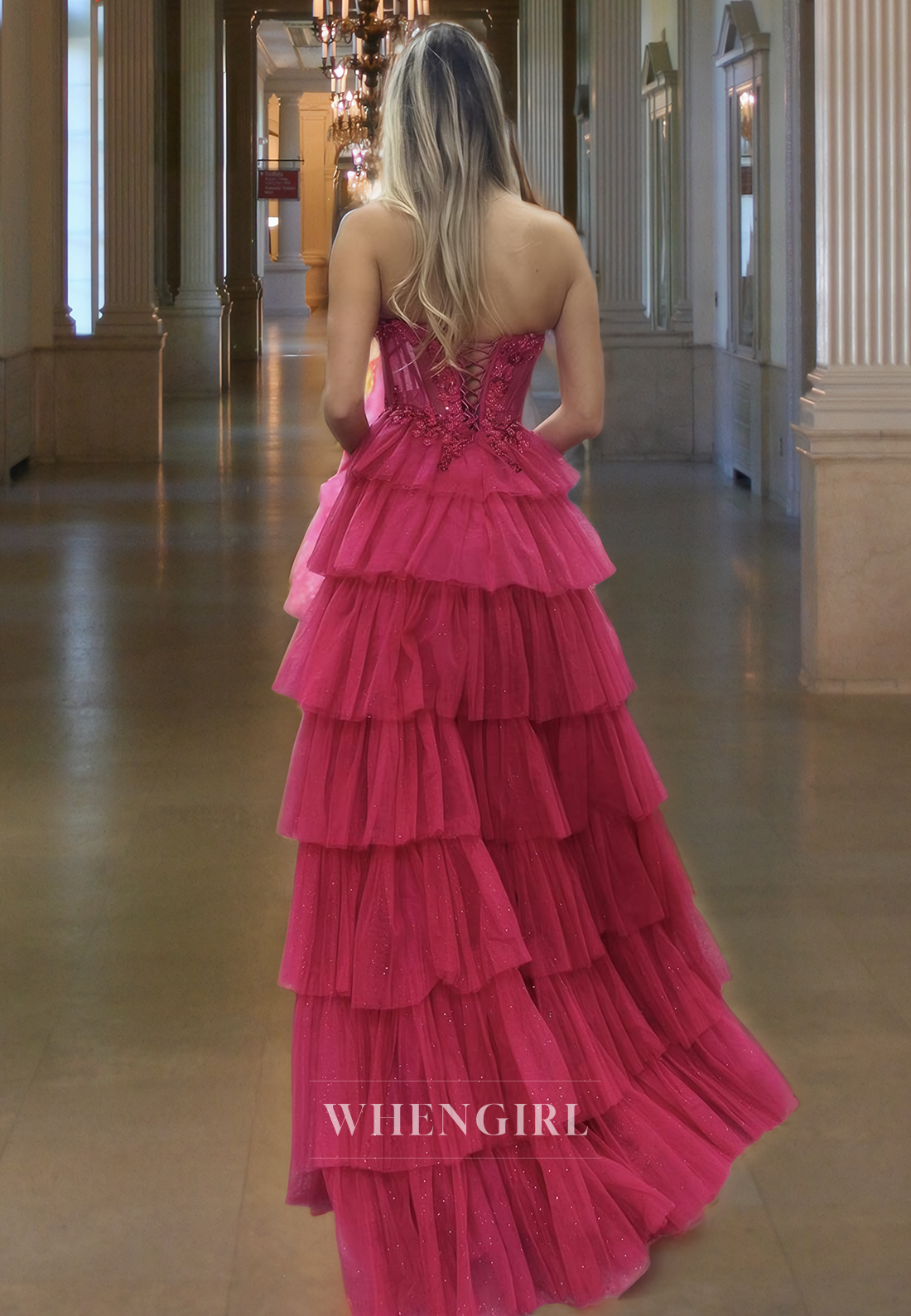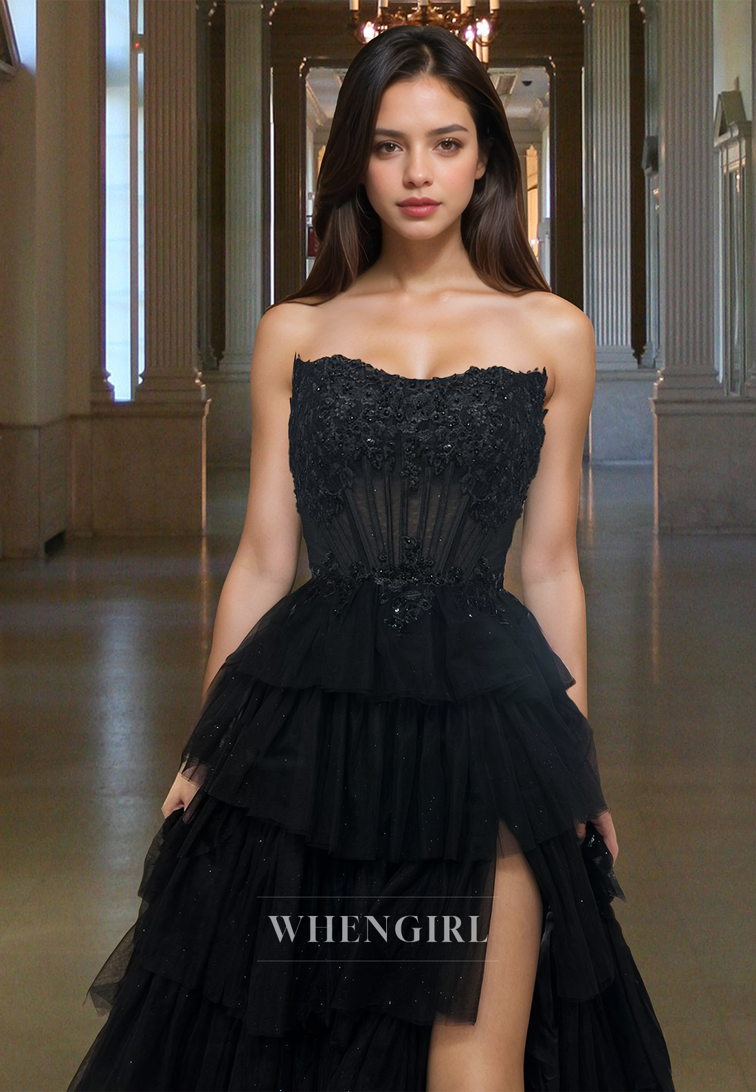 Elegant A-Line Tube Top Sleeveless High Slit Tiered Lace Ball Gown with Applique