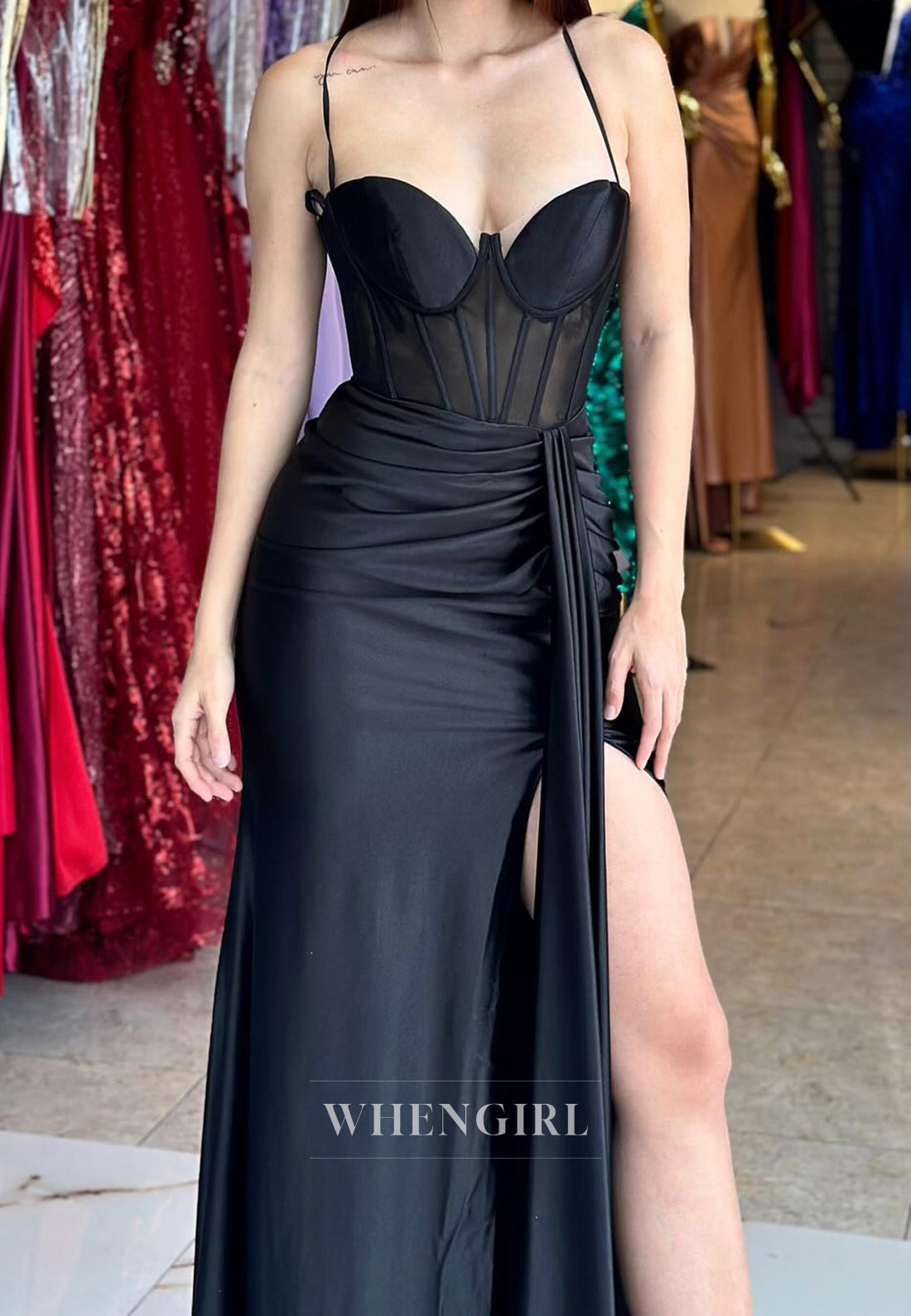 Elegant Spaghetti Straps Sweetheart Sheath Pleated Satin Formal Prom Dresss with Slit