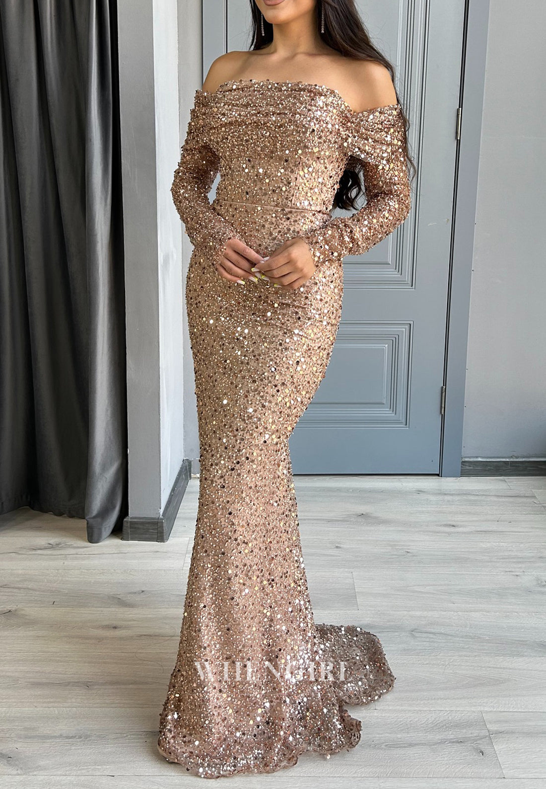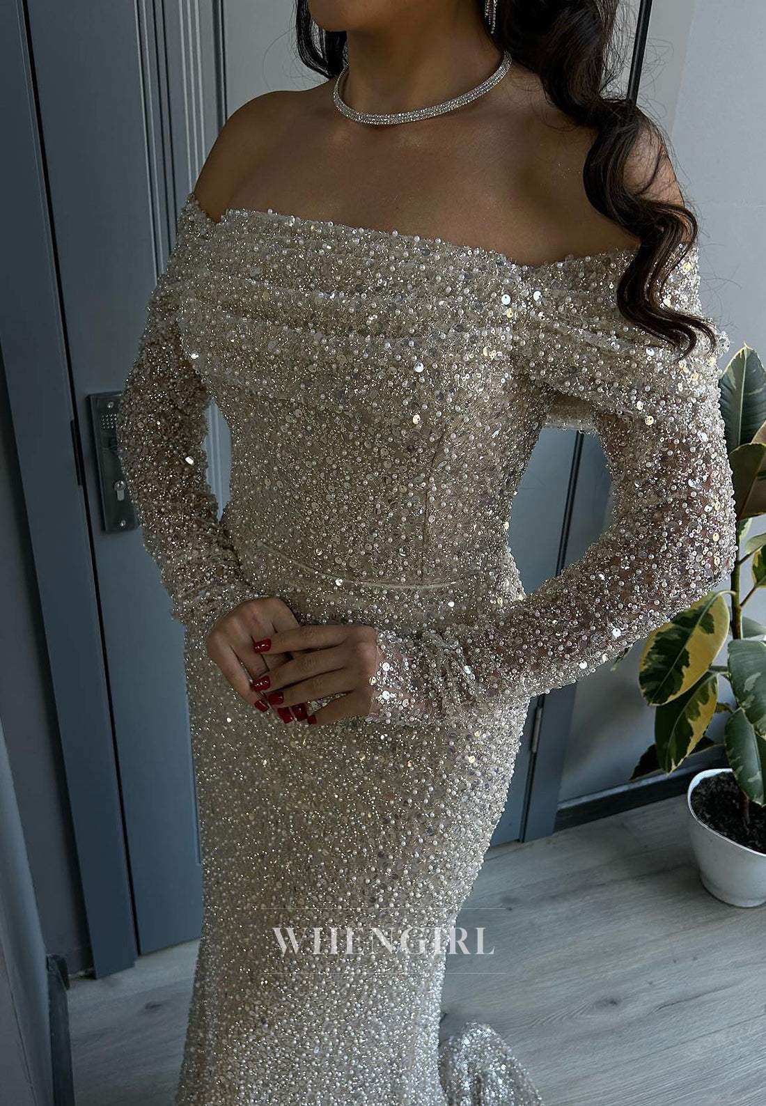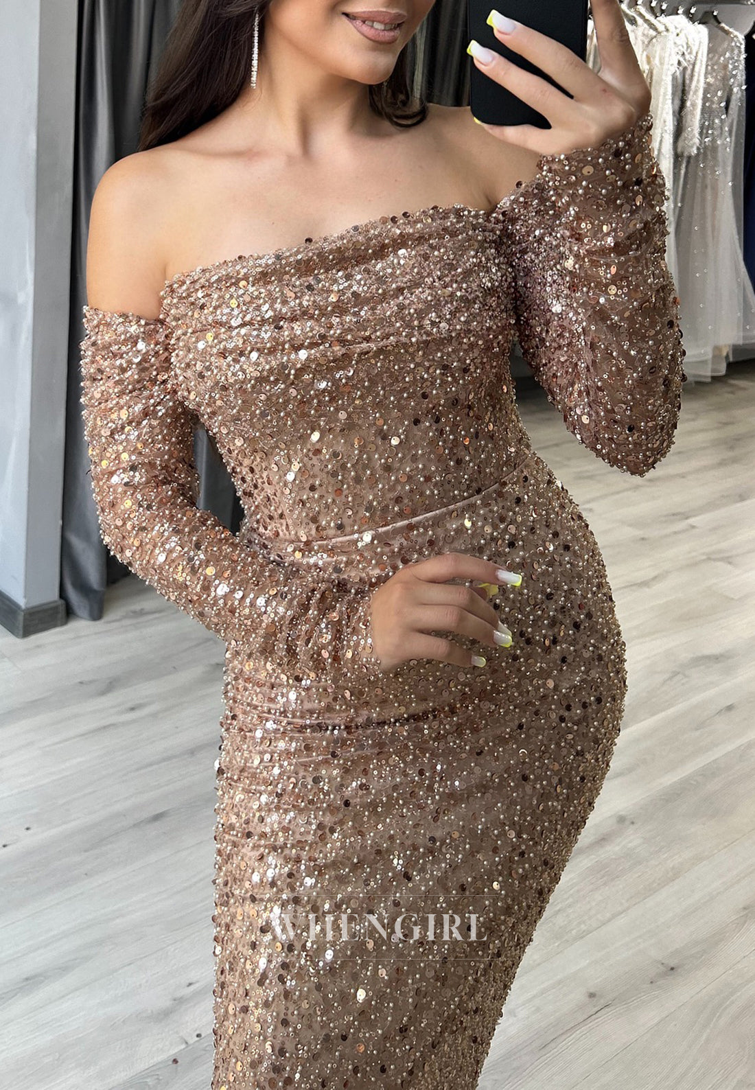 Sheath Off Shoulder Beaded Ruched Lace Up Evening Formal Gwon with Long Sleeves