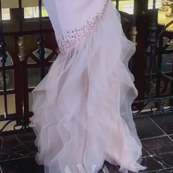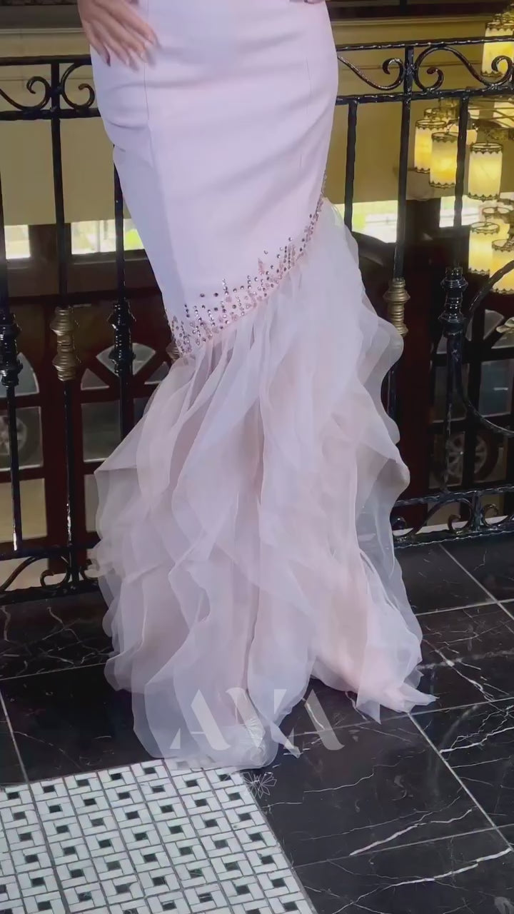 This light pink sheath evening dress features a sophisticated one-shoulder neckline and a sleeveless design that highlights refined elegance. The multi-tiered hem adds subtle dimension and movement, creating a graceful silhouette perfect for formal occasions.
