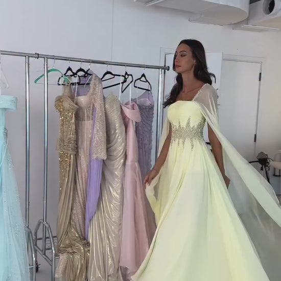 This light yellow evening dress features a sophisticated square neckline and long sleeves, enhanced with delicate beadwork for subtle shimmer. The A-line silhouette is both flattering and comfortable, complemented by a side slit that adds graceful movement. A back zipper ensures a smooth fit, making this dress an excellent choice for formal events that call for understated elegance and refined style.