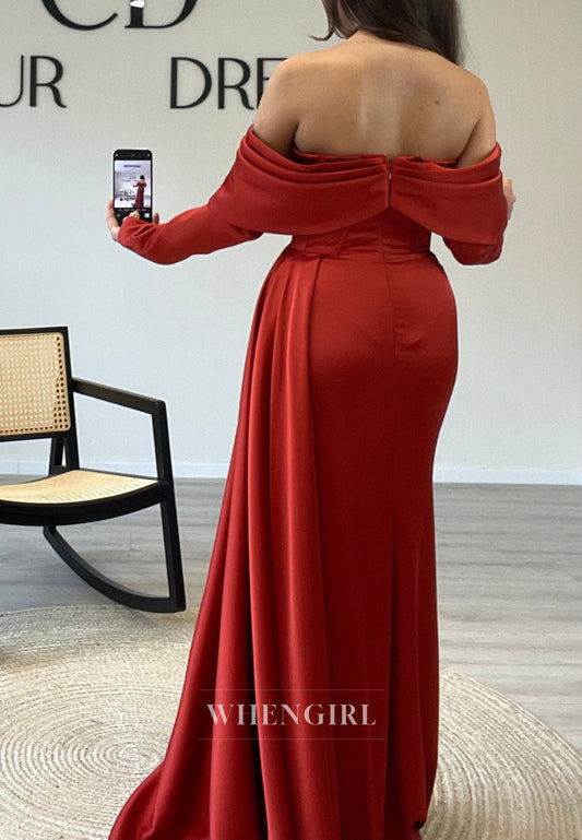 Sand Off Shoulder Beaded Side Slit Sweep Train Sheath Formal Evening Dress with Long Sleeves