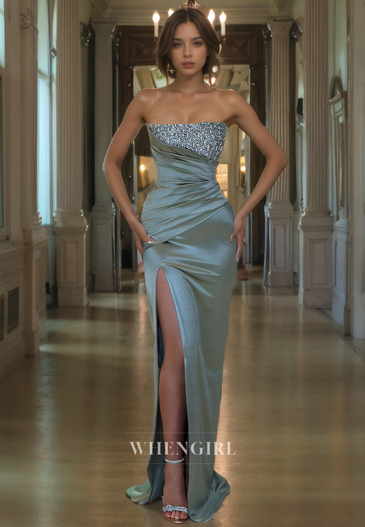 Sheath Strapless Straps Sleeveless Beaded Long Prom Dress with High Side Slit and Train