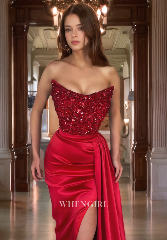 Sheath Strapless Sleeveless Pleated Sequins Satin Long Prom Dress with Slit and Train