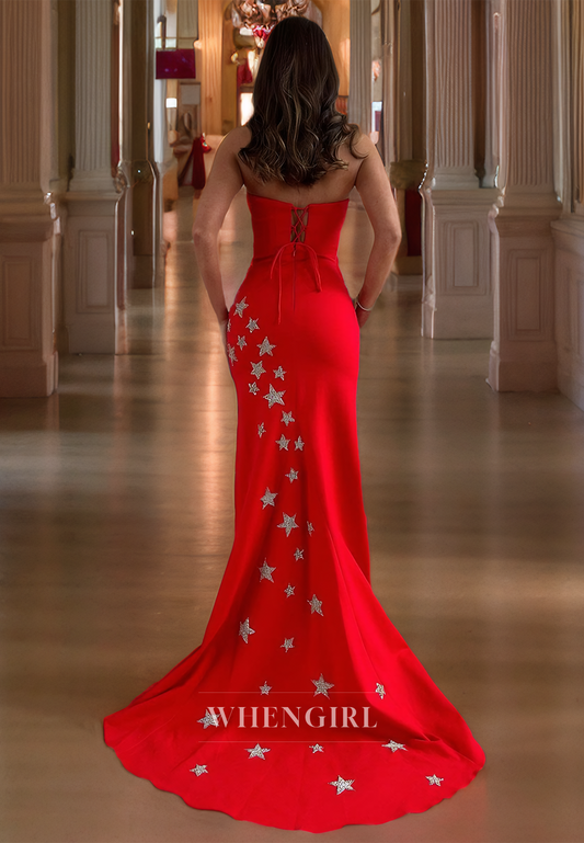 Sheath Strapless Sleeveless Satin Long Prom Dress with Side Slit and Stars