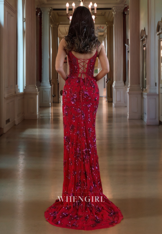 Sheath Strapless Straps Sleeveless Fully Lace Appliques Long Prom Dress with High Side Slit and Train