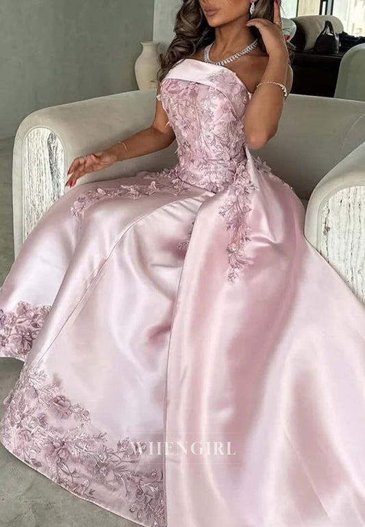 Pale Blush Sleeveless Appliqued Tube Top Formal Dress Floral Sheath Satin Evening Dress with Train