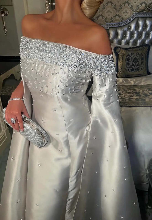 Silver Off Shoulder Beaded Sheath Bell Sleeves Long Formal Evening Dress