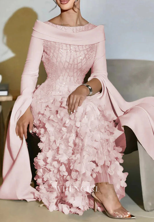 Column Bateau Neck Long Sleeves Floral Beaded Evening Formal Dress
