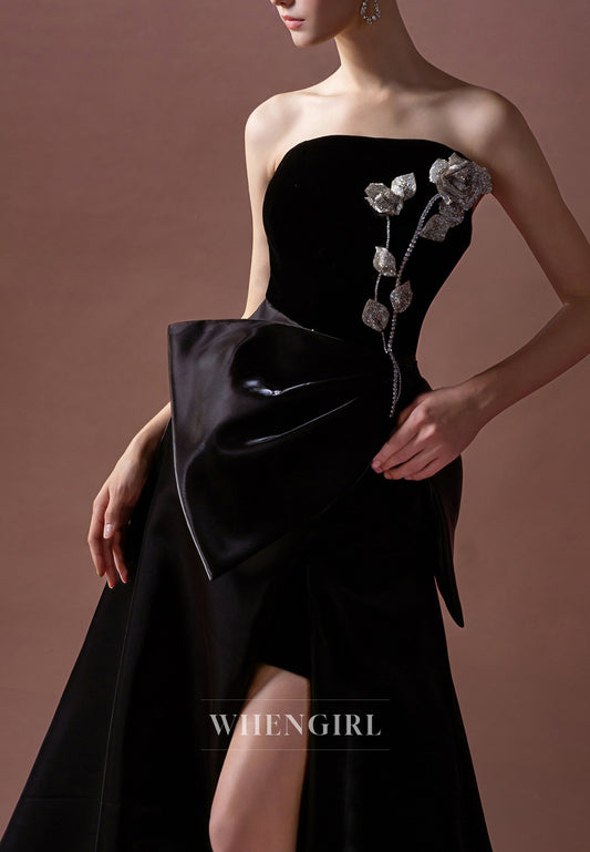 A-Line Black Strapless Side Slit 3D Flower Bowknot Formal Evening Gown with Court Train