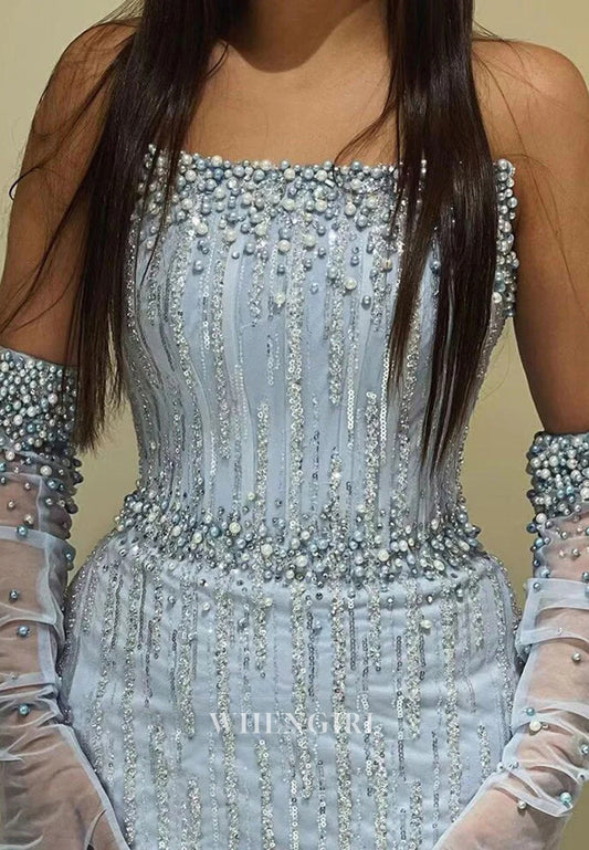 Light Blue Bateau Neck Strapless Pearls Sequins Beading Sheath Back Zipper Formal Evening Gown