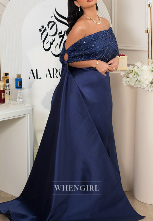 Navy Off Shoulder Beaded Sleeveless Satin A-Line Evening Formal Dress