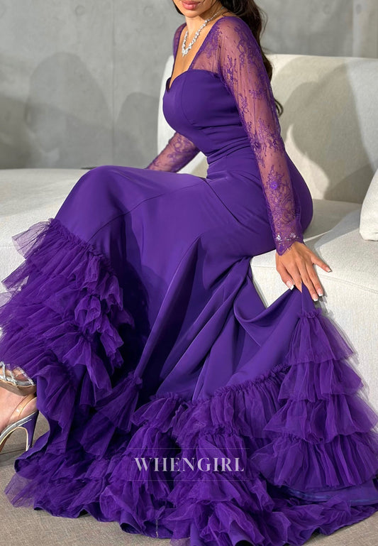 Regency V Neck Long Sleeves Formal Dress Multi Tiered Back Zipper Mermaid Evening Gown