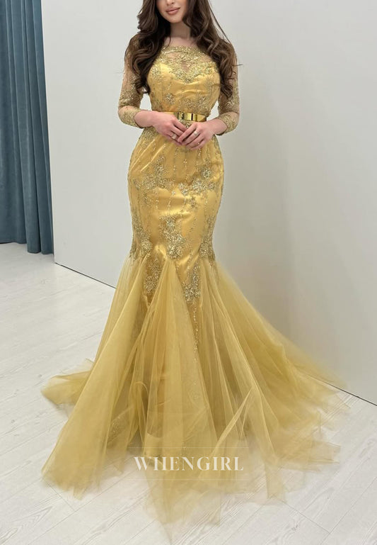 Gold Scoop Neck Embroidery Beads Tulle Mermaid Formal Evening Dress with 3/4 Sleeves