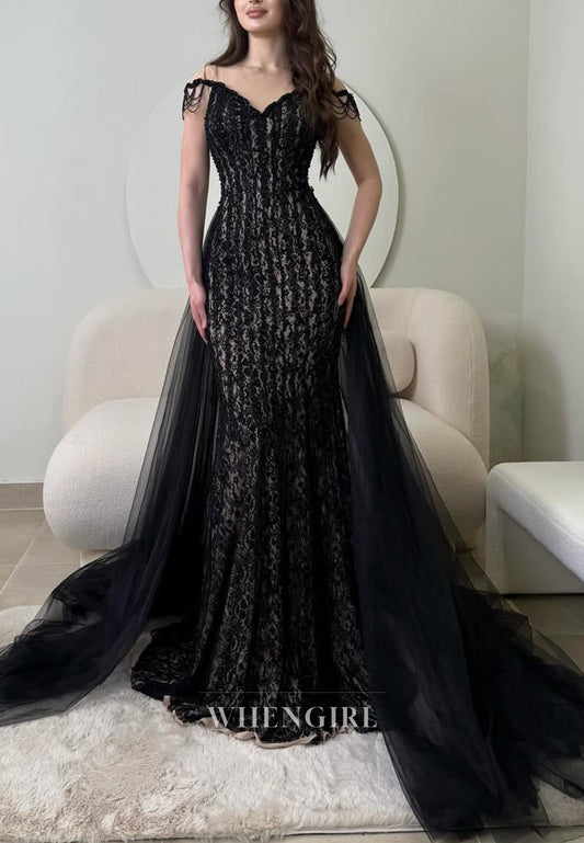 Black Sleeveless V Neck Mermaid Embroidery Lace Evening Formal Dress with Tulle Train