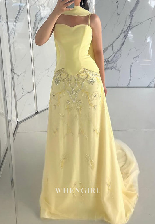 Daffodil Column Sweetheart Sleeveless Beaded Sweep Train Formal Evening Gown with Scarf