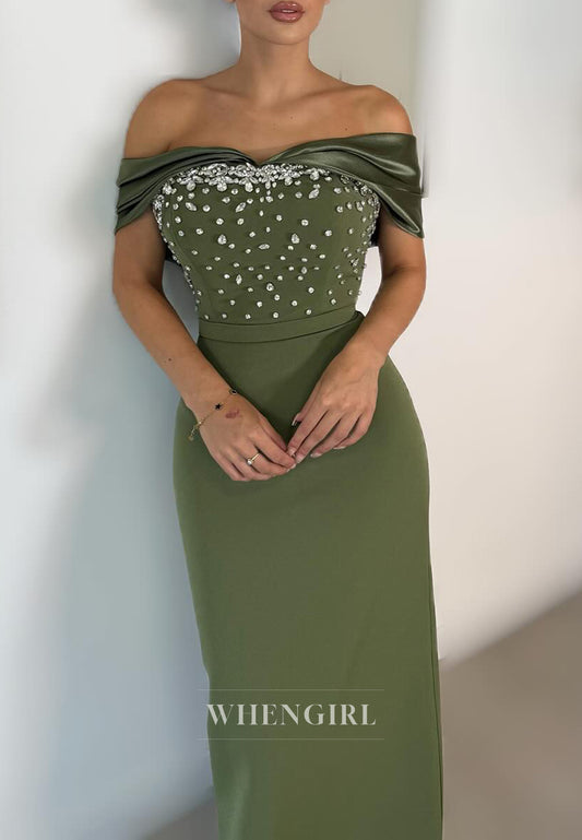 Celadon Off Shoulder Beaded Sleeveless Sheath Formal Dress Evening Gown