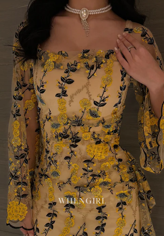 Elegant Long Sleeves Floral Sheath Square Neck Beaded Appliqued Formal Evening Dress