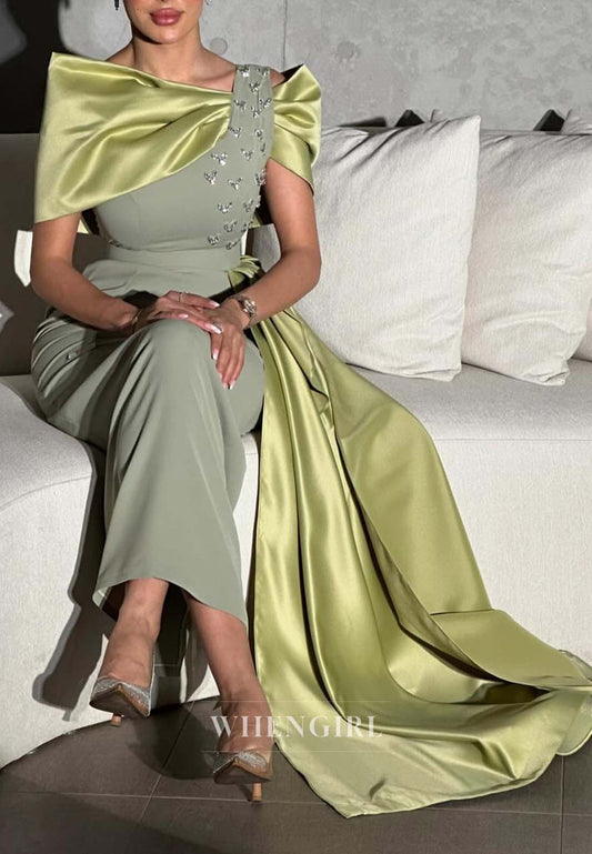Green Asymmetrical Neck Sheath Beaded Ankle Length Formal Dress Evening Gown with Side Train