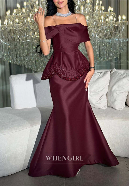 Burgundy Off Shoulder Beaded Mermaid Formal Dress Floor Length Evening Dress