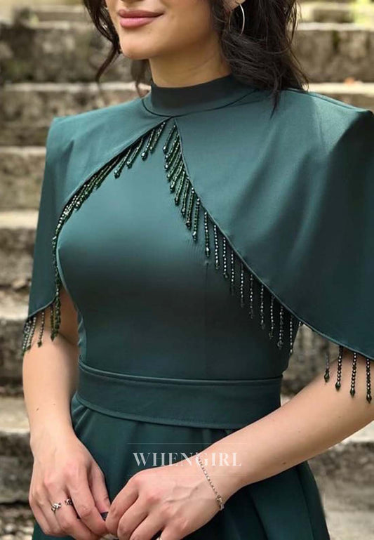 A-Line Short Sleeves High Neck Formal Dress Floor Length Tassel Evening Gown