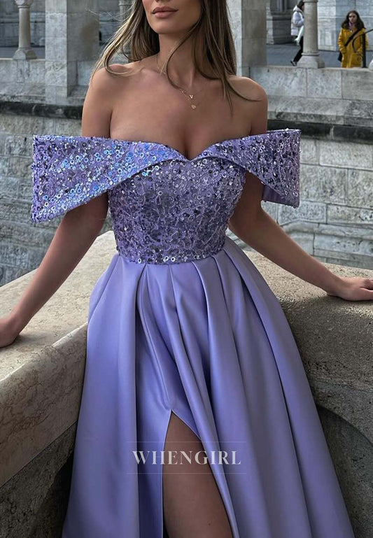 Violet Off Shoulder Beaded Evening Dress Side Slit Sleeveless A-Line Formal Dress