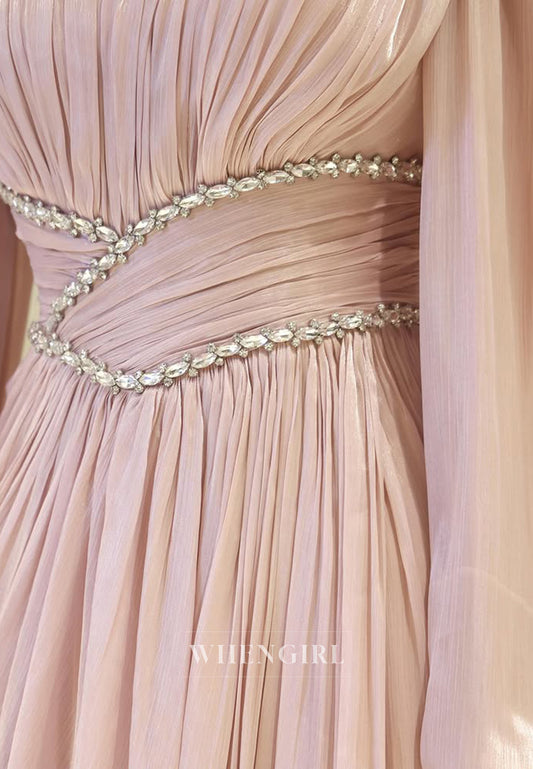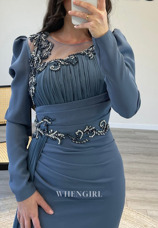 Long Sleeves Pleated Beaded A-Line Floor Length High Neck Sheath Formal Evening Gown