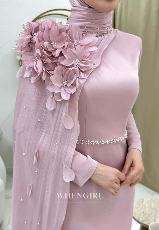 Pale Blush High Neck Long Sleeves Column Evening Dress Pearl Beaded 3D Flowers Formal Dress