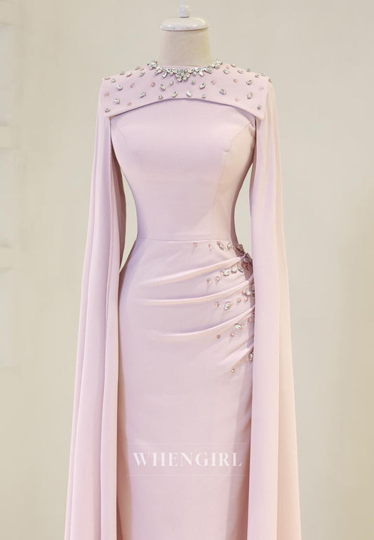 Sheath Long Bell Sleeves High Neck Evening Dress Pleated Beading Long Formal Gown