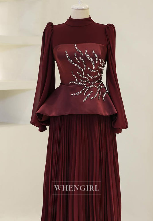 High Neck Long Sleeves Beaded Pleated Floor Length A-Line Formal Evening Dress