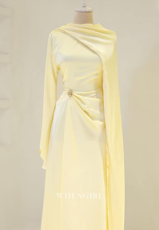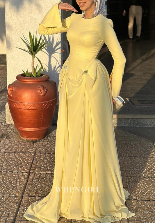Yellow Bateau Neck Long Sleeves Beaded Ruched A-Line Evening Dress