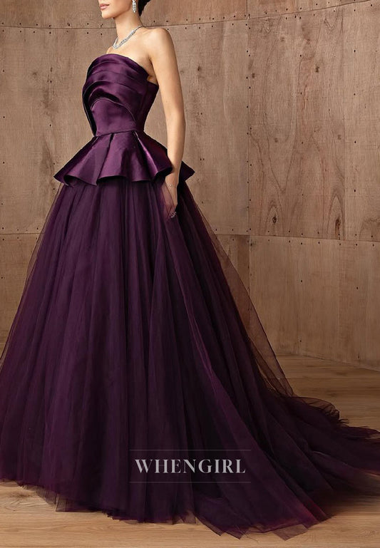 Raspberry Pleated Strapless Ball Gown Formal Evening Dress with Court Train