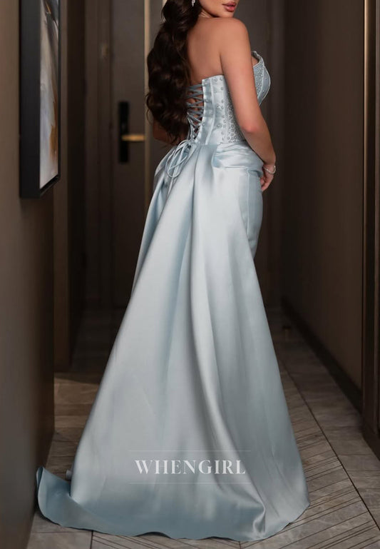 Blue Tube Top Detachable Sleeves Beaded Column Lace Up Evening Formal Dress