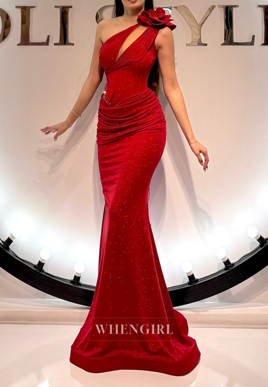 Burgundy One Shoulder 3D Flower Cut Out Pleated Mermaid Evening Formal Dress