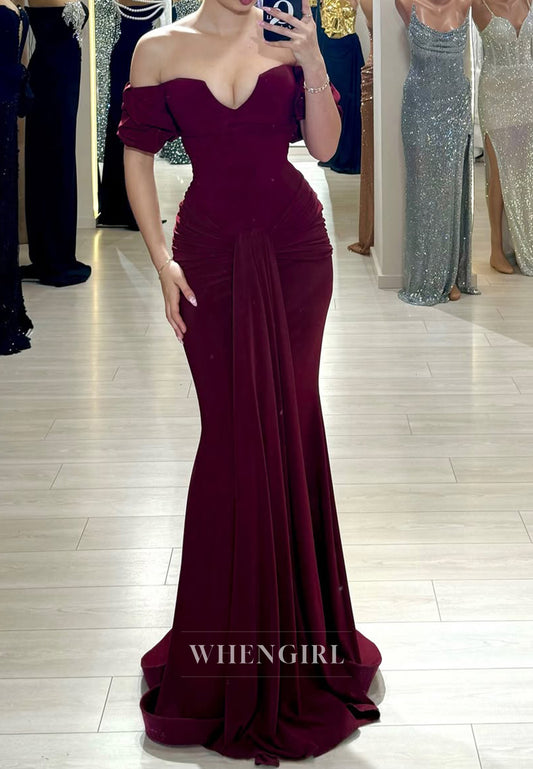 Burgundy Off Shoulder Pleated Strapless Mermaid Sweep Train Chiffon Formal Evening Gown