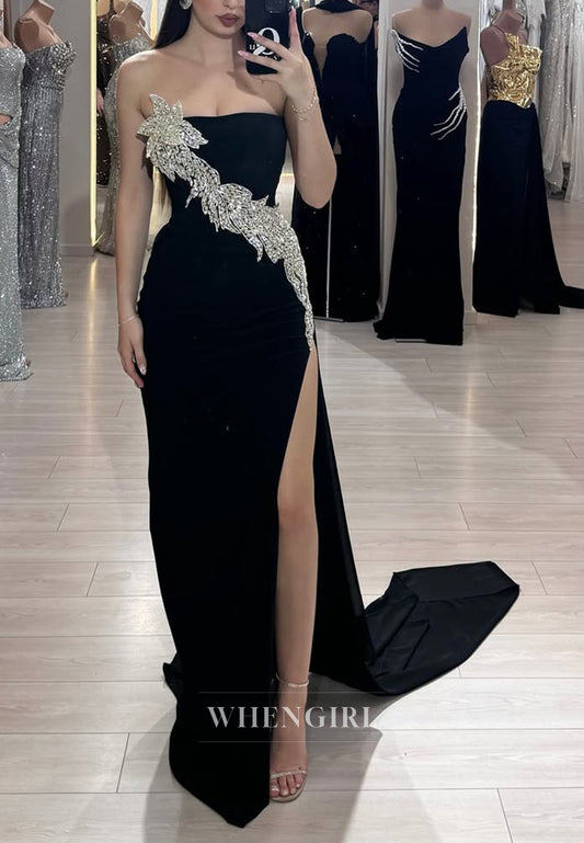Black Strapless Beaded Side Slit Sleeveless Sheath Formal Evening Gown with Sweep Train