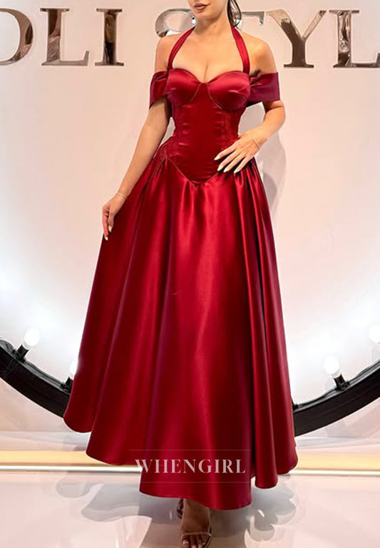 Burgundy Halter Ankle Length Satin A-Line Formal Evening Gown