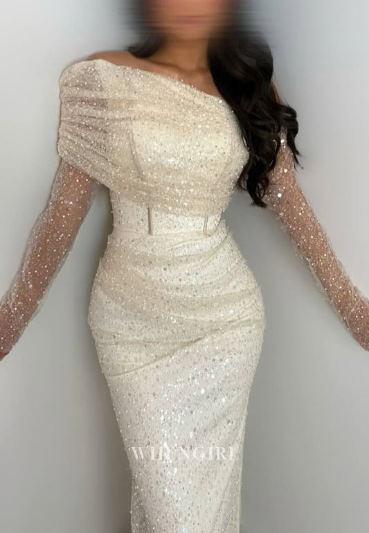 Ivory Pleated Sequins One Shoulder Long Sleeves Sweep Train Sheath Formal Evening Gown