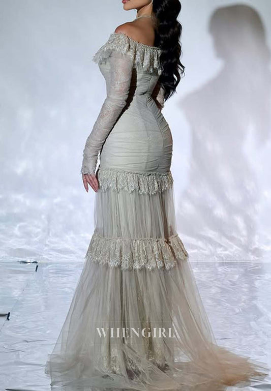 Agave Green Off Shoulder Long Sleeves Sheath Formal Dress Lace Sweep Train Evening Gown