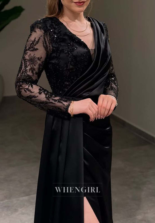 V Neck Lace Long Sleeves Formal Dress Side Slit Pleated Sheath Floor Length Evening Gown