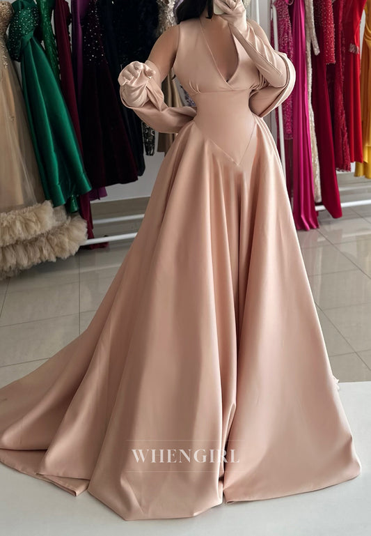 Light Coral V Neck Long Sleeves Cape Sweep Train A-Line Evening Dress