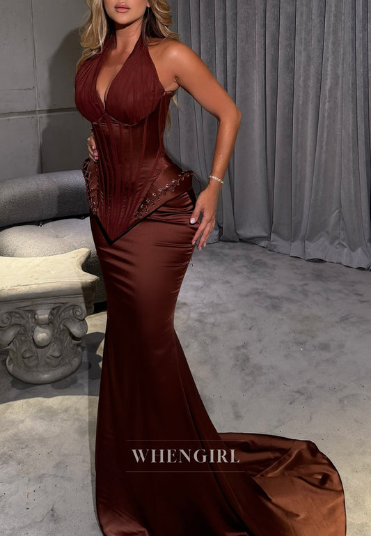 Chocolate Halter Corset Sleeveless Mermaid Sweep Train Formal Evening Gown