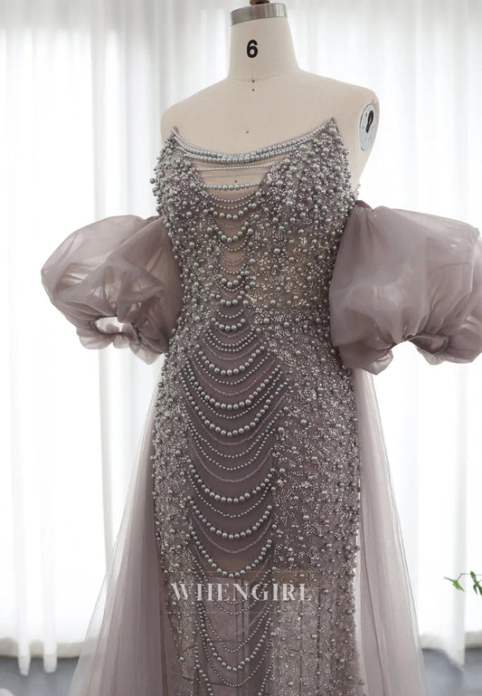 Silver Mauve Pearls Beading Sheath Formal Dress Strapless Sweep Trian Evening Gown with Cape