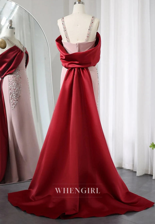 Luxury Dusty Pink V Neck Beaded Straps Back Zipper Column Formal Dress with Red Train