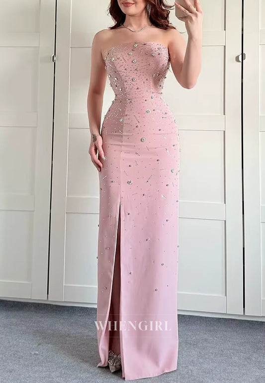 Sheath Tube Top Sleeveless Beaded Side Slit Floor Length Formal Evening Gown